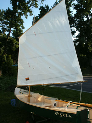 Before my next trip, I had changed the oar locks to the outside of the gunwale, replaced the mainsheet cleat with a cam cleat mounted on top of the daggerboard box, and repaired the various scratches. I reset the halyard so the upper yard would rest against the mast in the right spot. Several short sails and rowing trips have been successful. I have improved my technique of getting the boat on and off the trailer so I don't ding it up.